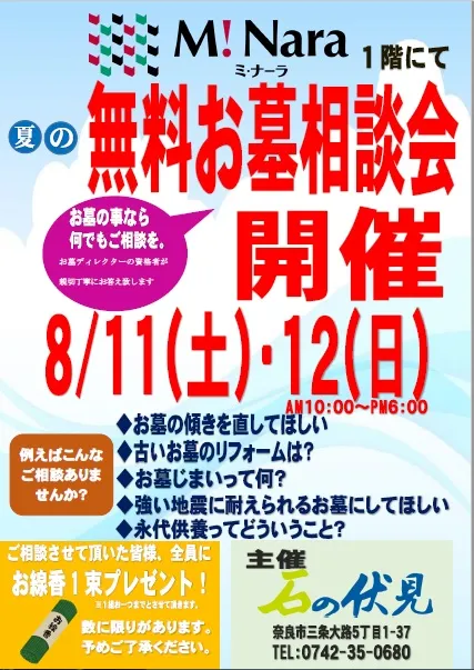 無料お墓相談会開催 8月11日(土)12日(日) ミナーラ特設会場にて